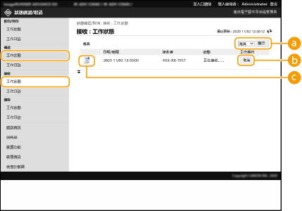 您可以檢查正在等待傳送的傳真和電子郵件、已經接收的傳真以及正在等待轉傳的傳真等文件的狀態。您也可以取消傳送與接收文件的程序。