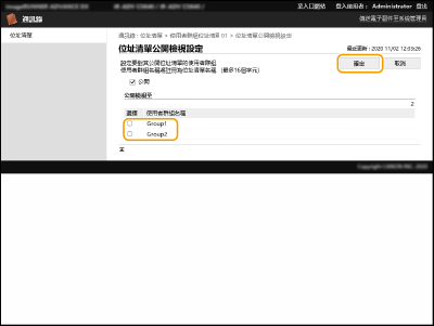 [個人位址清單/使用者群組位址清單設定] 並選擇 [套用使用者群組名稱變更到使用者群組位址清單名稱] 核取方塊。[套用使用者群組名稱變更到使用者群組位址清單名稱] 只有在已經啟用個人認證管理時才可使用。