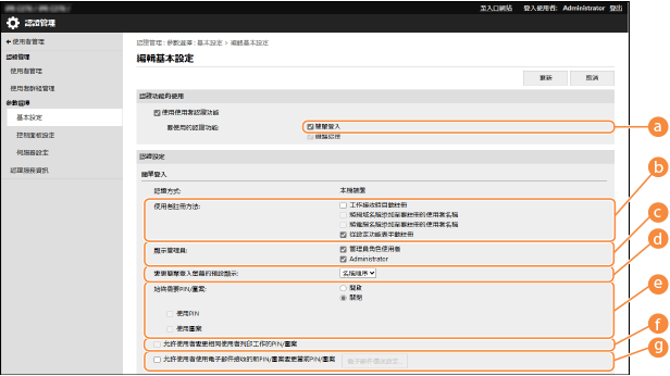 如果使用者名稱由數字組成且少於七位數,則同一組數字會被指派至相同使用者作為部門識別碼。如果將相同使用者的密碼註冊為少於七位數的數字,則這組數字也會設為部門識別碼的 PIN。
