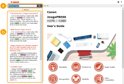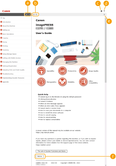 Click to specify settings such as text size, layout, and display method for the User's Guide.