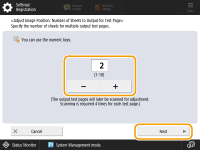 The larger the number of output test pages, the more accurate the adjustment is. If specifying multiple output test pages, make sure that all of the test pages are scanned in the order they are output. If the order is changed or the scanning process is not performed successively, the adjustment may not be made correctly. |