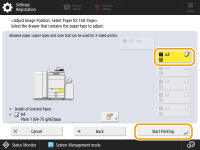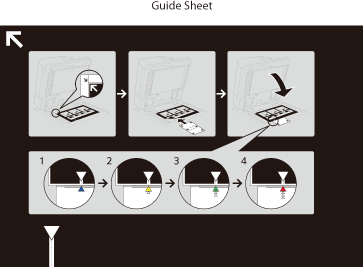 Clean the platen glass and the underside of the feeder before adjustment. Cleaning the Platen Glass/Cleaning the Feeder Use the following conditions to print the guide sheet. Accurate adjustment results may not be obtained if the guide sheet is not printed appropriately. Paper size: A3 or 11" x 17" Finish: Uncoated, 1-Sided Coated, or 2-Sided Coated Type: None (Normal) Basis Weight: Paper that two-sided printing can be performed on and is 80 g/m2 or heavier (paper that is 200 g/m2 or heavier is recommended) If an edge of the test page is cut incorrectly or folded, or the image is not correctly printed on the test page, the message <Correctly place the test page on the platen glass.> may appear during the scanning process. Adjustment may not be performed correctly with some types of paper, such as textured paper with rough surface or colored paper. If adjustment is not performed correctly when <Use Scanner> is selected, select <Do Not Use Scanner> instead. |