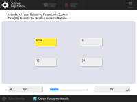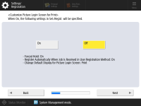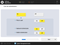 To enhance the security of the machine, use the machine under a system that uses user authentication. ![]() This machine is set to use the user authentication as the login service. For more information, see Configuring the Personal Authentication Management Settings. ![]() Press <On> for <Use User Authentication>, press <On> for the login method to use, and press <Next>. If you do not use user authentication, press <Off> for <Use User Authentication>, press <OK>, and proceed to Step 5. ![]() Specify the following settings if there are no administrators besides the "Administrator" user registered in the machine. ![]() To enhance the security of the machine by disabling the "Administrator" user and registering a new administrator, press <Yes>. In <Register Administrator>, enter <User Name> and <Password>, and press <OK>. Specify <E-Mail Address>, <Department ID>, and <Display Name> as necessary. For more information, see Registering User Information in the Local Device. The "Administrator" user will be disabled the next time you log in. To operate as "Administrator," press <No>. ![]() ![]() Select the timing for displaying the login screen. If you select <Display When Func Is Selected>, press <Functions> and <Color Copy/Print>, select the function to display the login screen for, and press <OK>. Also, select the setting items on the <Settings/Registration> screen to display the login screen for. If you select <Off> for <Picture Login> and <Keyboard Authentication>, press <OK>. Proceed to step 5. If you select <On> for <Picture Login> or <Keyboard Authentication>, press <Next>. ![]() ![]() To use authentication via numeric key entry only on the login screen, press <On>. If you select <Off> for <Picture Login>, press <OK>. Proceed to step 5. If you select <On> for <Picture Login>, press <Next>. ![]() ![]() Set whether to require users to enter a PIN or pattern when using Picture Login, and press <Next>. ![]() ![]() When you want to use Picture Login with the machine being in an appropriate condition for the print function, press <On>. This setting enables the following: use the Forced Hold Printing function, utilize print data sent from a computer for user registration, and display by default an appropriate login screen for each individual user when that user operates the machine for printing. For more information, see Configuring the Forced Hold Printing Settings, <User Registration Method>, and <Change Default Display for Picture Login Screen>. ![]() ![]() Select the number of preset buttons on the Picture Login screen, and press <OK>. | |