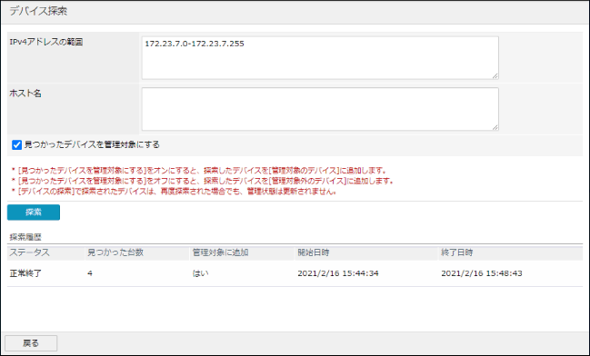 [デバイス探索]ページで、管理対象デバイスを設定します。
