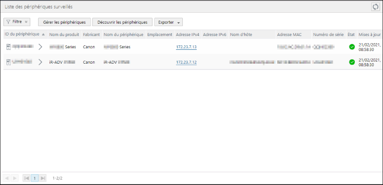 [ID du périphérique] | Cliquez sur [ID du périphérique] pour vérifier/modifier les informations détaillées du périphérique sur la page [Détails du périphérique]. Vous pouvez aussi supprimer des périphériques de la liste des périphériques surveillés. Pour en savoir plus, voir : |