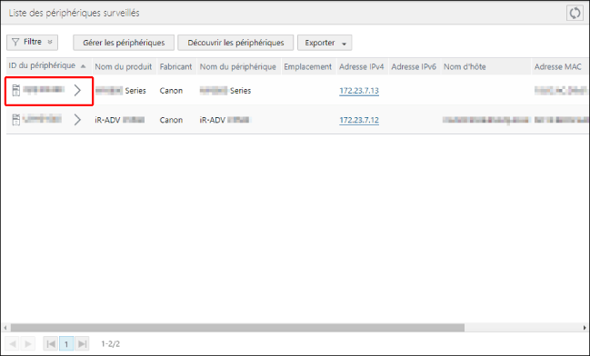 [Supprimé de la gestion] | Supprime le périphérique affiché de la gestion. Si vous exécutez cette opération sur un périphérique surveillé, ce périphérique n'est plus surveillé. |