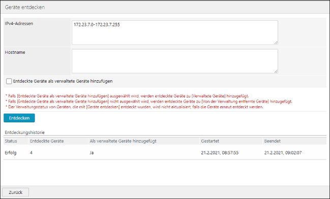 Geben Sie auf der Seite [Geräte entdecken] die IPv4-Adresse oder den Hostnamen des zu entdeckenden Geräts ein.