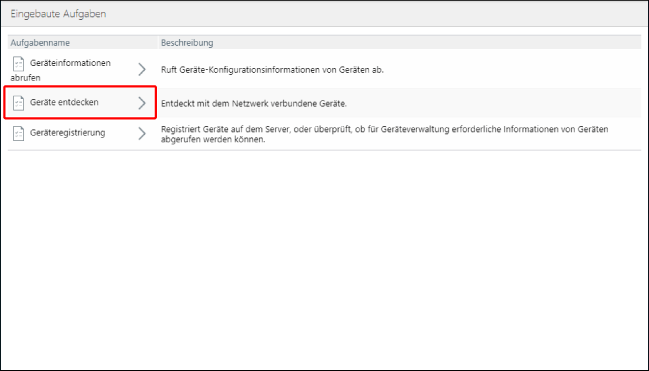 Es ist nicht notwendig, Geräte zu entdecken, wenn die Geräteinformationen (wie IP-Adresse und MAC-Adresse) bereits auf dem Fernüberwachungsserver registriert sind. Wenn eine Geräteerkennungsaufgabe konfiguriert wird, bevor die Einstellungen auf der Seite [Verbindungseinstellungen] konfiguriert werden, ist es nicht erforderlich, Geräte nach der Konfiguration der Einstellungen auf der Seite [Verbindungseinstellungen] manuell zu entdecken, da die Geräteerkennung automatisch durchgeführt wird. |
