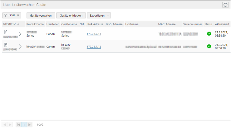 Die Anzahl der Geräte, die überwacht werden können, hängt von dem Protokoll für die Kommunikation mit dem Fernüberwachungsserver und der Überwachungsmethode ab. Näheres dazu finden Sie hier. |