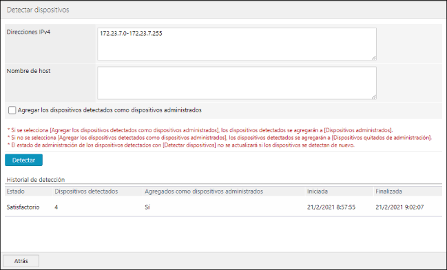 Configure los dispositivos que desea administrar en la página [Detectar dispositivos].
