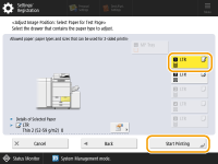 Clean the platen glass and the underside of the feeder before adjustment. Cleaning the Platen Glass/Cleaning the Feeder Use the following conditions to print the guide sheet. Accurate adjustment results may not be obtained if the guide sheet is not printed appropriately. Paper size: A3 or 11" x 17" Finish: Uncoated, 1-Sided Coated, or 2-Sided Coated Type: None (Normal) Basis Weight: Paper that two-sided printing can be performed on and is 80 g/m2 or heavier (paper that is 200 g/m2 or heavier is recommended) If an edge of the test page is cut incorrectly or folded, or the image is not correctly printed on the test page, the message <Correctly place the test page on the platen glass.> may appear during the scanning process. Adjustment may not be performed correctly with some types of paper, such as textured paper with rough surface or colored paper. If adjustment is not performed correctly when <Use Scanner> is selected, select <Do Not Use Scanner> instead. |