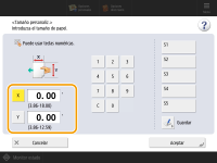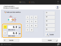 Pulse <X> o <Y> para introducir la longitud de cada cara mediante las teclas numéricas. ![]() Si registra el tamaño de papel que utiliza con más frecuencia en los botones <S1> a <S5>, puede recuperarlo con solo pulsar una vez. Registrar papel de tamaño libre (Tamaño de papel personalizado) | |