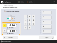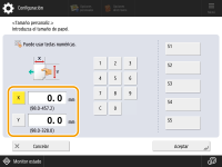 Pulse <X> o <Y> para introducir la longitud de cada cara mediante las teclas numéricas. ![]() Si registra el tamaño de papel que utiliza con más frecuencia en los botones <S1> a <S5>, puede recuperarlo con un solo toque. Registrar papel de tamaño libre (Tamaño de papel personalizado) | |