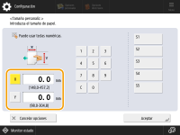 2 | Seleccione el tipo de sobres cargados en el casete. Al utilizar sobres de tamaño personalizable, pulse <Personalizado>  <Siguiente>  e introduzca el tamaño del sobre. Pulse <X> o <Y>  y utilice las teclas numéricas para introducir la longitud del lado correspondiente. |
