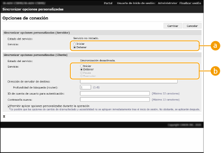 Para utilizar el equipo como servidor/cliente, seleccione [Iniciar] para [Servicio] en [Sincronizar opciones personalizadas (Servidor)] y [Sincronizar opciones personalizadas (Cliente)].