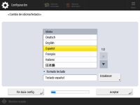 Seleccione el idioma que debe aparecer en las pantallas. En función del idioma, puede cambiar la disposición del teclado que aparece para introducir caracteres. ![]() ![]() Seleccione el idioma y pulse <Aceptar>. Para cambiar la disposición del teclado, pulse <Establecer>, seleccione la disposición del teclado y pulse <Aceptar>. Mostrar el botón para cambiar el idioma resulta práctico si se hace con frecuencia. Cambiar el idioma de visualización | |