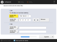 Especifique la dirección del servidor DNS, el nombre del host DNS y el nombre del dominio DNS. ![]() ![]() Pulse <Servidor DNS primario> y <Servidor DNS secundario>, introduzca la dirección IPV4/IPv6 para el servidor DNS y pulse <Siguiente>. Para obtener información sobre las opciones de la dirección del servidor DNS, consulte Configurar opciones de DNS. ![]() ![]() Pulse <Nombre de host> para introducir el nombre del equipo (nombre de host). Pulse <Nombre de dominio> para introducir el nombre de dominio al que pertenece el equipo, y pulse <Siguiente>. Si las opciones de IPv4 y IPv6 son iguales, pulse <Sí> para <Usar el mismo nombre de host/nombre de dominio que para IPv4>. ![]() ![]() Para actualizar automáticamente mediante las Opciones de actualización dinámica de DNS, pulse <Sí> para <Actualización dinámica de DNS>, y pulse <Aceptar>. Si configura <Actualización dinámica de DNS> para <IPv6> como <Sí>, seleccione <Sí> para registrar los elementos automáticamente. | |