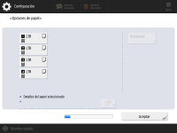 Compruebe que el papel cargado en los casetes está bien especificado. ![]() ![]() Si los tamaños del papel son correctos, pulse <Aceptar>. Para obtener información en pantalla e instrucciones sobre cómo cambiar las opciones, consulte Especificar el tamaño y tipo de papel en el depósito/casete de papel. Si no ha iniciado sesión como administrador, continúe con el paso 10. | |