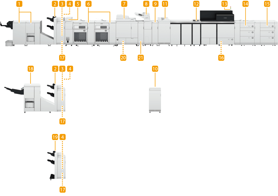 「パーフェクトバインダー・F」 を装着すると、製本からのり付け、断裁、積載までを行えます。詳細については「パーフェクトバインダー・F」の取扱説明書を参照してください。