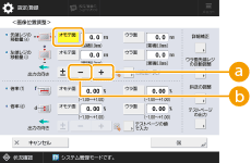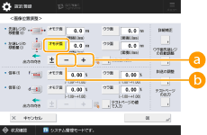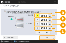 3 | 実測値<b><h>をオモテ面、ウラ面とも入力する ![]() <b>テストページの<b>の長さの実測値を入力します。 <h>テストページの<h>の長さの実測値を入力します。 例に挙げたとおり<b>の長さを360.0 mm、<h>の長さを355.5 mmに設定すると、差分である0.5 mm分のゆがみは自動的に補正されます。 |