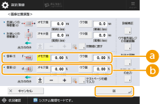 1 | <画像位置調整>画面の<倍率 (f)>/<倍率 (d)>で、拡大/縮小したい割合(%)を設定 <OK>を押す![]() <倍率 (f)>搬送方向に対して平行に、入力した割合だけ画像が拡大/縮小されます。 <倍率 (d)>搬送方向に対して垂直に、入力した割合だけ画像が拡大/縮小されます。 必要に応じて、再度テストページの出力を行って、正しく補正されたかを確認してください。 |