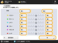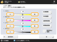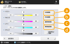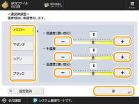 ![]() | イエロー(黄)、マゼンタ(赤系)、シアン(青系)、ブラック(黒)の濃度を個別に調整します。 |
