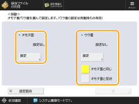 両面プリント時にウラ面の画像も移動させたい場合は、<ウラ面>の設定が必要です。オモテ面と同じ位置に移動する場合は<オモテ面と同じ>を押し、左右対称に移動する場合は<オモテ面と反対>を押します。オモテ面と異なる位置に移動させたい場合は、<設定>を押して移動距離を入力します。