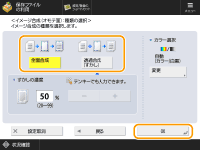 フォーム画像をそのまま合成するときは、<全面合成>を押します。文字や画像にフォーム画像が重なってしまっても透けて見えるよう、フォーム画像の濃度を薄くして合成する場合は、<透過合成 (すかし)>を押し、濃度を入力します。