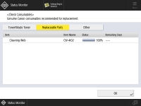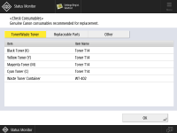 Press  (Status Monitor)  <Toner/Other>  <Check Consumables>.