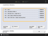 On this screen, you can also check the counter information for each MEAP application. Press <Check MEAP Counter> on the screen in step 2. If you press <Device Info./Other> <Check Device Configuration> on the same screen, you can check the options installed in the machine and the version of the security chip for storage device data encryption.