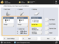 3 | Specify the detailed settings for the sheet insertions press <OK>.To select the paper for the sheet insertions, press <Change> for <Select Paper> select the paper source press <OK>.![]() If you set a different paper size for the front flyleaf, back flyleaf, or insert sheets, the paper sizes for the other features are automatically changed to the new paper size. However, changing the paper source for a feature to a source with the same paper size does not change the settings for the other features. Before feeding paper from the "Document Insertion Unit-R," load paper into the "Document Insertion Unit-R" and specify the paper size. ![]() You can insert a total of up to 100 sheet insertions. |