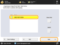 If you want to print a form image by itself to check the output, select the form image from the list and press <Check Print>. If you want to confirm the size of the form image and the overlap setting, press <Details>.