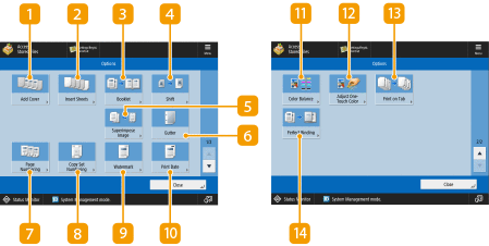 | <Print Sample> appears only if you set to make multiple prints and one of the following settings at the same time. Note that the available functions may differ depending on your model and the installed options. <Collate (Page Order)> <Offset> <Staple + Collate> <Booklet> <Front Cover> <Insert Sheets> <Merge Files and Print> when multiple files are selected |
