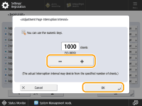 Set a value between 50 and 9999 sheets as the interruption interval for adjustment pages, and then press <OK>.