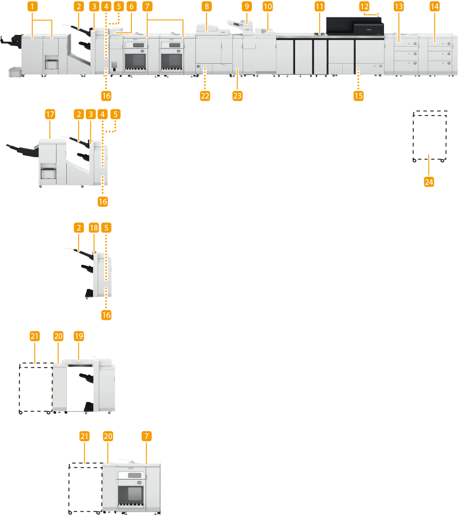For information on the combination of options that can be installed on the machine, contact your dealer or service representative. Available optional products may differ depending on your country or region. Some of the settings may not be displayed depending on the configuration of optional equipment installed on the machine. |