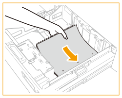 The procedure for loading tab paper into the POD Deck-E/Secondary POD Deck-E is the same as the one for loading tab paper into the paper decks of the main unit. As an example, the procedure for the paper decks of the main unit is explained in this section. For more information on aligning the size change plate for the Document Insertion Unit-R, see Loading Paper into the Document Insertion Unit-R |