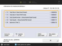Appuyez sur <Service de contrôle> <Test de communication> pour vérifier la communication avec le serveur de surveillance à distance. Lorsque cette fonction est exécutée, les informations sur l'appareil sont périodiquement envoyées au serveur de surveillance à distance. Pour pouvoir utiliser cette fonction, vous devez activer la communication entre l'appareil et le serveur assurant le service.Vous pouvez imprimer une liste indiquant le nombre de pages utilisées pour la copie, impression et numérisation. Sur cet écran, vous pouvez aussi vérifier les informations du compteur de chaque application MEAP. Appuyez sur <Vérifier cpteur MEAP> sur l'écran à l'étape 2. Si vous appuyez sur <Infos périph./Autre> <Vérif. config. périphérique> sur le même écran, vous pouvez vérifier les options installées sur l'appareil et la version de la puce de sécurité pour le cryptage des données du périphérique de stockage.Pour en savoir plus sur les conditions de compte, contactez votre revendeur ou représentant de service. |