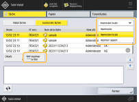 (Suivi statut), l'écran de Suivi statut s'affiche, vous permettant de vérifier l'historique des utilisations de chaque fonction comme la copie, l'impression, l'envoi d'e-mails, l'envoi/réception de I-fax, etc. À partir de cet écran, vous pouvez aussi imprimer l'historique des utilisations de chaque fonction.![]() |