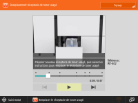 Le réceptacle de toner usagé est un réceptacle destiné à collecter le toner non utilisé restant lors de l'impression. Pour en savoir plus sur chaque message, reportez-vous à la section Contre-mesures pour chaque message. Pour plus d'informations sur le numéro de modèle du réceptacle de toner usagé, voir Pièces consommables. Pour obtenir des instructions détaillées relatives au remplacement du réceptacle de toner usagé, appuyez sur <Précédent> ou sur <Suivant> sur l'afficheur tactile. Le réceptacle de toner usagé peut être remplacé lorsque la machine est en fonctionnement. Vous pouvez vérifier l'espace actuel restant dans le réceptacle de toner usagé. Vérification de l'espace restant dans le réceptacle de toner usagé |