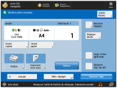 Préparer une nouvelle bobine de nettoyage avant de démarrer le processus de remplacement. Appuyez sur <Précédent> et <Suivant> sur l'afficheur tactile pour revoir le processus de remplacement. Les tâches interrompues par le remplacement de la bobine de nettoyage reprenne automatiquement après le remplacement. |