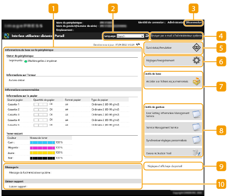 Certains éléments et fonctions de l'affichage ne sont disponibles que si vous vous connectez avec des privilèges Administrateur. Si plusieurs utilisateurs utilisent l'interface utilisateur distante en même temps ou si le panneau de commande de l'appareil est utilisé en même temps que l'interface utilisateur distante, la dernière opération exécutée est appliquée. |