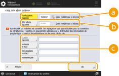 <Admin. système> / <Adresse e-mail> / <Informations contact> / <Commentaire>Saisissez les informations nécessaires sur l'administrateur.