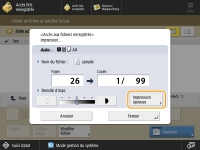 <Impression épreuve> s'affiche lors de copies multiples en mode Tri séquentiel, Décalage ou Agrafage. <Impression épreuve> peut être utilisé lorsque "Module de Finition agrafage-AF", le "Module de Finition P.A.C.-AF", ou le "Module de réception grande capacité-J" est installé. |