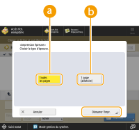 Il est impossible de sélectionner <Impression épreuve> pour les tâches suivantes. Une tâche avec le mode Tri groupé ou Décalage défini Une tâche en attente de copie ou interrompue Une tâche de test d'impression Une tâche de copie d'épreuve en cours Si la copie restante est la dernière ou presque la dernière, on ne peut pas imprimer d'épreuve en sélectionnant <Toutes les pages>. Si le nombre de pages d'une copie est insuffisant, on ne peut pas imprimer d'épreuve en sélectionnant <1 page (aléatoire)>. L'impression peut durer un certain temps même si l'on sélectionne <Impression épreuve>. |