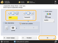 Pour superposer l'image de forme sans régler la densité, appuyez sur <Aplat>. Pour superposer l'image de forme avec une densité réduite, appuyez sur <Transparent> et réglez la densité.