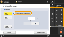 Quando vengono visualizzati i tasti numericiQuando viene visualizzato <  Si possono usare i tasti num.>, è possibile immettere i valori numerici utilizzando i tasti numerici. Esempio: schermata di impostazione <Cancellazione pagina> Quando viene visualizzato <  Immettere con i tasti numerici.>, solo i tasti numerici possono essere utilizzati per l'inserimento dei numeri. |
