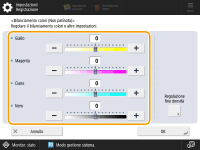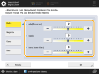 Premere  (Impostazioni/Registrazione) <Regolazione/Manutenzione> <Regolazione qualità immagine> <Bilanciamento colori>.