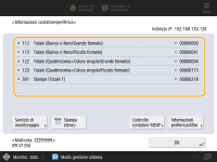 Premere <Servizio di monitoraggio> <Test di comunicazione> per verificare la comunicazione con il server di monitoraggio remoto. Quando viene eseguita questa funzione, le informazioni sulla macchina vengono inviate periodicamente al server di monitoraggio remoto. Per poter utilizzare questa funzione è necessario abilitare la comunicazione tra la macchina e il server che fornisce il servizio.È possibile stampare un elenco che mostra il numero di pagine usate per la copia, la stampa e la scansione. In questa schermata, è possibile verificare anche le informazioni del contatore per ciascuna applicazione MEAP. Premere <Controllo contatore MEAP> sullo schermo nella fase 2. Se si preme <Informazioni periferica/Altro> <Contr.config. periferica> nella stessa schermata, è possibile verificare le opzioni installate nella macchina e la versione del chip di sicurezza inerente alla crittografia dei dati sulla periferica di memorizzazione.Per informazioni sulle condizioni di conteggio, contattare il rivenditore o il responsabile dell'assistenza. |