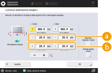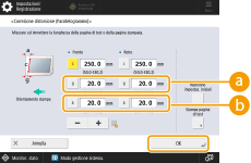 3 | Inserire i valori <g> e <a> per il lato anteriore e posteriore  premere <OK>. <g>Inserire la lunghezza misurata del segno <g> sulla pagina di prova. <a>Inserire la lunghezza misurata del segno <a> sulla pagina di prova. Seguendo l'esempio, inserire 20,5 per <g> e 21,0 per <a>. La differenza tra <g> e <a> (0,5 mm) viene corretta automaticamente. |