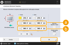 3 | Inserire i valori <b> e <h> per il lato anteriore e posteriore. <b>Inserire la lunghezza misurata del segno <b> sulla pagina di prova. <h>Inserire la lunghezza misurata del segno <h> sulla pagina di prova. Seguendo l'esempio, impostando una lunghezza di 360,0 mm per <b> e di 355,5 mm per <h> la differenza di distorsione di 0,5 mm viene automaticamente corretta |